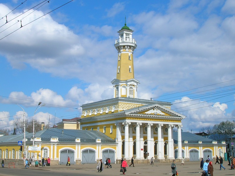 Пожарная каланча – символ Костромы и Костромской области. Её общая высота 35 метров. Это одна из самых выразительных архитектурных вертикалей города. Увидев её, император Николай I, посещавший Кострому в 1834 году, с восхищением воскликнул: «Такой у меня в Петербурге нет!». Каланча имела, конечно, не только художественное, но и практическое значение: деревянная Кострома страдала от пожаров и неоднократно выгорала почти полностью. Решение о постройке каменной каланчи было принято именно потому, что деревянные пожарные вышки огонь уничтожал вместе с другими постройками. |